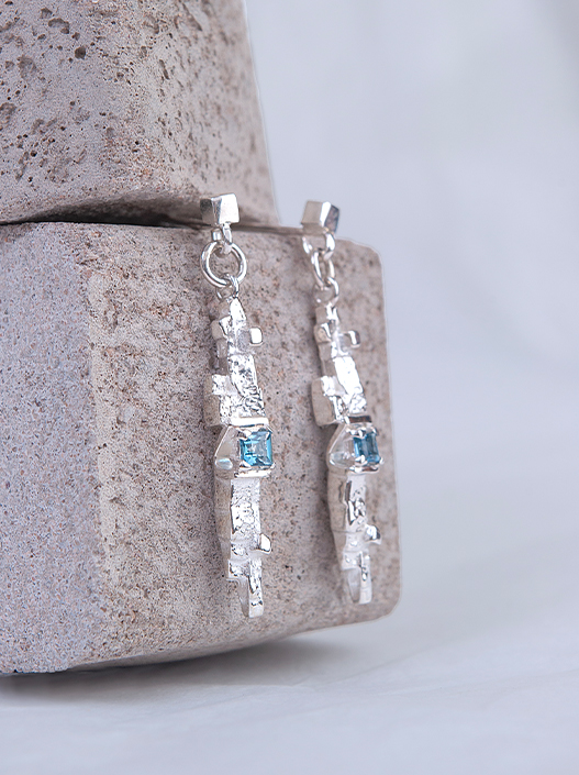 A pair of stunning designer drop earrings, inspired by the Churchill Barriers in Orkney. Featuring intricate textured blocks that echo the rugged concrete blocks that make up the iconic causeways, and adorned with deep ocean London Blue Topaz gemstones. These earrings are perfect for those who appreciate craftsmanship and distinctive design.